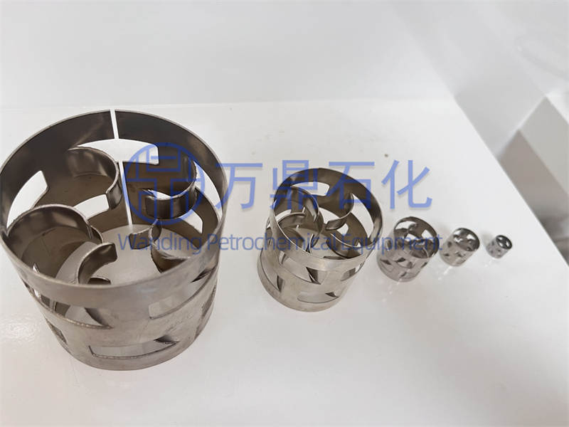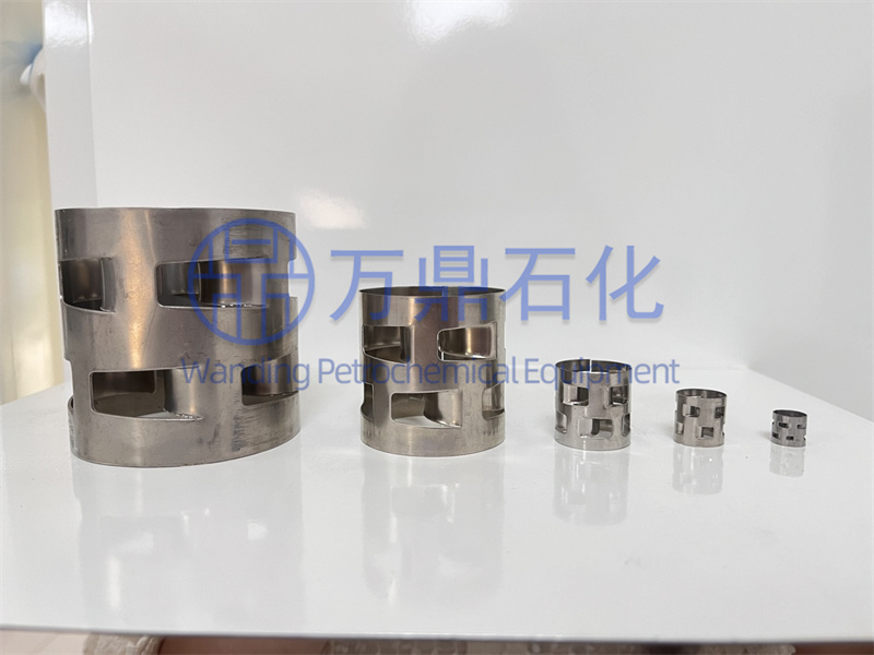 鮑爾環是基于拉西環的不足之處的改進產物。其結構構造是在拉西環的側壁上開出一排或兩排長方形的帶有內伸舌片的矩形窗孔,窗孔的內彎葉片在環中心幾乎相搭,一般開孔的總面積約為整個環面積的35%。改進后的結構使環內空間以及環內表面利用率大幅提高,氣相湍動得以增加,氣液分布狀態得以改善,緩解了溝流與壁流現象。