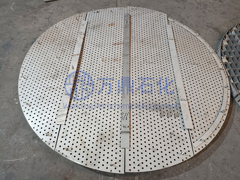 操作過(guò)程中,氣相高速吹過(guò)塔板,將液相吹散成細(xì)小的液滴。氣相作為連續(xù)相,液相作為分散相。網(wǎng)孔塔板上還裝有傾斜的擋沫板,它采用與塔板結(jié)構(gòu)相同的網(wǎng)孔板,但斜孔的開(kāi)口寬度為6~8 mm。擋沫板與水平方向成10~60°,其上開(kāi)孔與塔板上的斜孔方向成90°,可將噴射的液滴擋下來(lái),從而**降低了塔板的霧沫夾帶。同時(shí),擋沫板本身也是一個(gè)**的傳質(zhì)元件,這樣充分利用了塔板的空間。